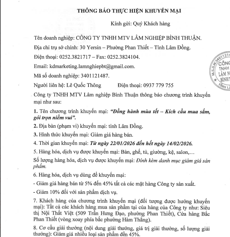 CHƯƠNG TRÌNH KHUYẾN MẠI 2026 ''ĐỒNG HÀNH MÙA TẾT - KÍCH CẦU MUA SẮM, GÓI TRỌN NIỀM VUI Từ ngày 22/01/2026 - 14/02/2026 22/01/2026 115 lượt xem Link file Bài viết liên quan Xem tất cả 05/01/2026 BIÊN BẢN CUỘC HỌP CÔNG KHAI BẢN KÊ TÀI SẢN THU NHẬP HÀNG NĂM 2025 BIÊN BẢN CUỘC HỌP CÔNG KHAI BẢN KÊ TÀI SẢN THU NHẬP HÀNG NĂM 2025 Xem chi tiết 22/12/2025 Công ty TNHH MTV Lâm nghiệp Bình Thuận kỷ niệm 10 năm ngày thành lập Công ty TNHH MTV Lâm nghiệp Bình Thuận kỷ niệm 10 năm ngày thành lập Xem chi tiết 05/12/2025 TỔ CHỨC THÀNH CÔNG ĐẠI HỘI ĐẠI BIỂU CÔNG ĐOÀN CƠ SỞ CÔNG TY TNHH MTV LÂM NGHIỆP BÌNH THUẬN LẦN THỨ X, NHIỆM KỲ 2025 - 2030 TỔ CHỨC THÀNH CÔNG ĐẠI HỘI ĐẠI BIỂU CÔNG ĐOÀN CƠ SỞ CÔNG TY TNHH MTV LÂM NGHIỆP BÌNH THUẬN LẦN THỨ X, NHIỆM KỲ 2025 - 2030 Xem chi tiết 21/11/2025 Hội nghị lần thứ 4 của Mạng lưới các Công ty Lâm nghiệp năm 2025 Hội nghị thường niên của Mạng lưới các Công ty Lâm nghiệp năm 2025 Xem chi tiết 21/11/2025 CHƯƠNG TRÌNH KHUYẾN MẠI 2025 ''KỶ NIỆM 10 NĂM THÀNH LẬP CÔNG TY (16/12/2025); NGÀY NHÀ GIÁO VIỆT NAM 20/11 VÀ MỪNG TẾT DƯƠNG LỊCH 2026 TƯNG BỪNG KHUYẾN MẠI CÙNG NỘI THẤT VIỆT Xem chi tiết 06/11/2025 CHƯƠNG TRÌNH KHUYẾN MẠI 2025 ''KỶ NIỆM 10 NĂM THÀNH LẬP CÔNG TY (16/12/2025); NGÀY NHÀ GIÁO VIỆT NAM 20/11 VÀ MỪNG TẾT DƯƠNG LỊCH 2026 CHƯƠNG TRÌNH KHUYẾN MẠI 2025 ''KỶ NIỆM 10 NĂM THÀNH LẬP CÔNG TY (16/12/2025); NGÀY NHÀ GIÁO VIỆT NAM 20/11 VÀ MỪNG TẾT DƯƠNG LỊCH 2026 Xem chi tiết 22/09/2025 GIẤY CHỨNG NHẬN ĐĂNG KÝ DOANH NGHIỆP CÔNG TY TNHH MTV GIẤY CHỨNG NHẬN ĐĂNG KÝ DOANH NGHIỆP THAY ĐỔI LẦN THỨ 4 NGÀY 17/9/2025. Xem chi tiết 29/07/2025 BÁO CÁO TÀI CHÍNH 6 THÁNG NĂM 2025 BÁO CÁO TÀI CHÍNH 6 THÁNG NĂM 2025 ĐÃ KIỂM TOÁN Xem chi tiết